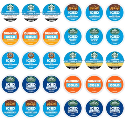 An assortment of 30 flavored, medium, and dark roast ICED coffee K-Cup pods