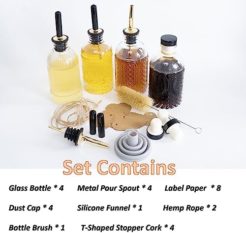 【Leak-Proof and Keep Fresh】 Simple syrup bottle set includes 4 different styles of glass bottles, 4 non-drip stainless steel metal pouring spouts, 4 bottle stoppers to prevent you from spilling when you travel with the syrup dispenser, 1 collapsible silicone funnel, 1 brush so you can easily pour new syrup and clean the bottles, comes with twine and 8 label papers so you can mark the liquid in the bottles.