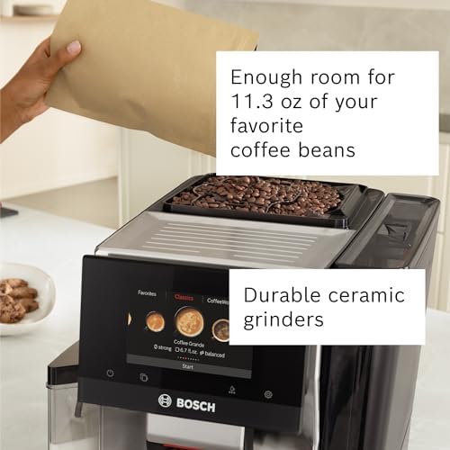 Experience the joy of making your own barista-quality coffee with the Bosch 800 Series VeroCafe. This fully automatic espresso machine lets you discover the widest variety* of 35+ different beverages, all available in the Home Connect app with just one swipe. Customize every cup exactly how you like it and save your favorite coffee creations — from Americano to Caffe Crema. The Aroma Max System delivers consistent coffee quality and grinds your favorite beans with an optimally controlled flow rate, as well as the ideal temperature and amount of water for each drink. Enjoy a creamy latte macchiato, a bold ristretto, or a smooth flat white — all at the touch of a button on the user-friendly Active Select Display. Personalize your coffee to your taste by choosing one of the aroma strength levels. Enjoy ultimate convenience with key features, like cup illumination and the guided cleaning and descaling program, Calc’n Clean. • Active Select Display • Home Connect app • Double Cup • Milk Express Comfort (Integrated Milk Container) • 3 aroma options plus 4 coffee strength options • Coffee Pot Function • Cup Warmer • Dimensions (WxHxD): 12 1/6 in x 15 in x 18 2/5 in *Select models. Based on the number of beverage types that Bosch countertop fully-automatic espresso machine (“FAEM”) with Coffee World can make compared to other non-commercial countertop FAEMs, as of January 2024 in the U.S. and Canada.
