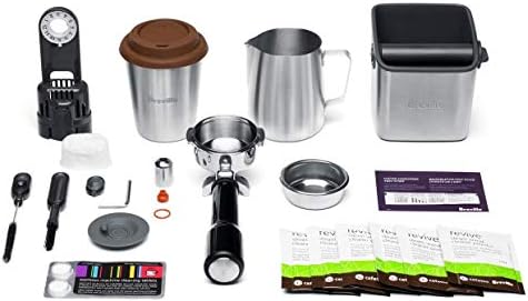 INCLUDED ACCESSORIES: Mini Grinds Bin, 58mm Full Stainless Steel Portafilter, 1 and 2 cup Single Wall Filter Baskets, 16oz Stainless Steel Milk Jug, Steam Wand Spare Parts, Cleaning Kit, Water Hardness Test Strip, Water Filter Holder and Water Filter