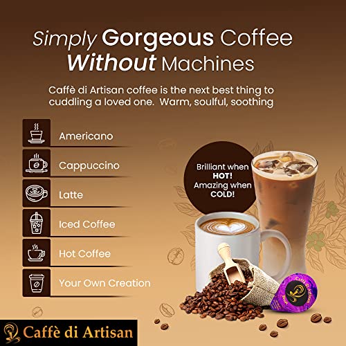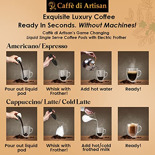 Experience the divine taste of Caffè di Artisan: Game-changing, machine-free liquid coffee pods. 100% Natural & Preservative-free coffee capsules. Caffè di Artisan is loved by thousands across the world. See the testimonials video in the carousel. Sampler Bundle is a great pick as it offers five machine-free premium-quality coffee pods from South America, Africa, and Asia. These coffee flavors are pure heaven. Our fine liquid coffee is extracted slowly over days in our Artisanal Micro-filtery in Southern Europe. Our flavored coffee pods are machine-free. So ultra convenient wherever you go! As a coffee lover, you now have authentic coffee, which soothes your mind, body, and soul. Use it at home, in the office, on a trek, or on a vacation. Our machine-free liquid Single-serve coffee pods are True Liberation! This makes whipping up an amazing latte, cappuccino, frappé, and Americano, super easy! Say adios to burnt, bitter coffee that you get at coffee shops. Bring in real luxury coffee through our coffee concentrate that’s utterly exquisite to taste. And super easy to make! Get rid of plastic guilt once and for all with our biodegradable coffee pods. For us, the environment is non-negotiable.