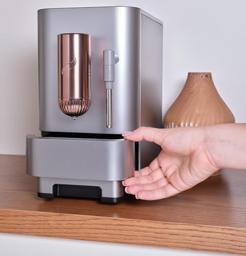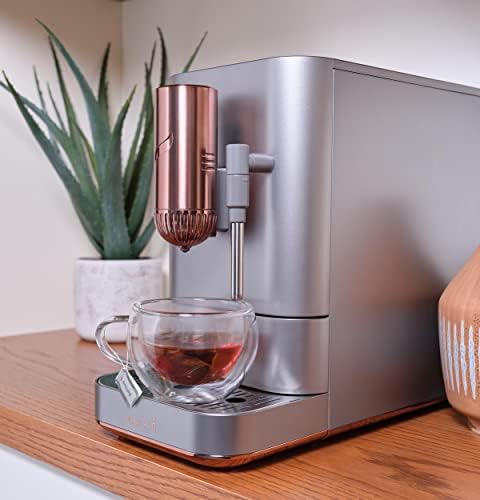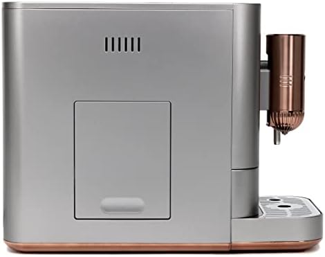 Make delicious Espresso, Americano, or dispense hot water with the Café Affetto Automatic Espresso Machine + Milk Frother. With a single press of a button and in less than 90 seconds, this automatic espresso machine dispenses your desired brew. Customize drink preferences by volume and strength, with a smart espresso machine that syncs with the SmartHQ app. This compact espresso machine has a 7″ wide footprint and is adorned with signature copper accents, adding style and sophistication to any countertop. The built-in steam frother foam technology creates a variety of textures: airy for cappuccino, denser for latte macchiato and more. The wand rotates to the right at 90 degrees for control and convenience. Beans remain fresh in the built-in bean hopper that holds over 6 ounces. To ensure even extraction for a balanced tasting cup, beans are pre-infused with low pressure to gently bloom optimal flavor profiles and gradually increased to 20 bars of high rated pump pressure. You can control your grind size with 5 levels ranging from coarsest to finest for ideal taste and aroma extraction. With a removable water reservoir, adjustable dispensing spout, and 15.8 ounce frothing pitcher, cleaning and using your espresso machine is easier than ever.