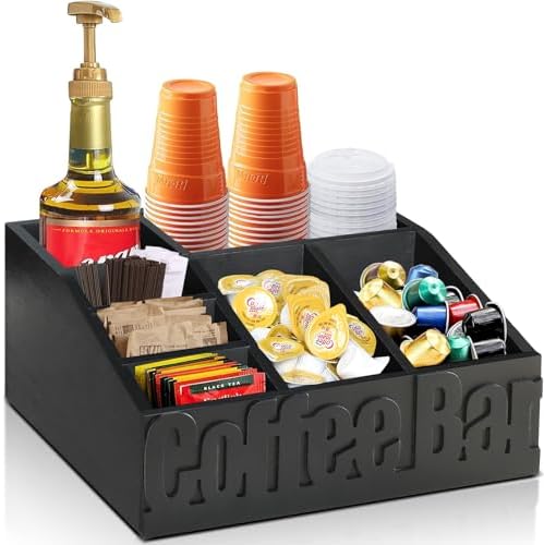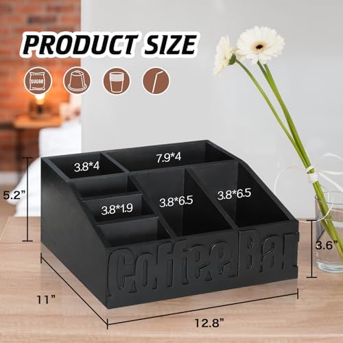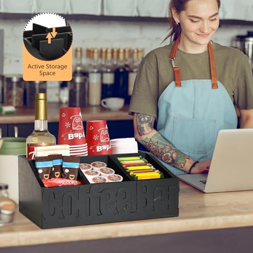 ☕【Perfect Companion to Organize Coffee Bar Accessories】Our coffee bar organizer for counter has 7 compartments, which will help you to organize coffee pods, sugar, tea bags, cups, straws, coffee beans, etc. There are 3 movable partitions inside coffee station organizer, so you can adjust internal structure according to your needs. With this coffee station holder, you can effortlessly keep your coffee bar tidy, easily access your coffee accessories, and create your own unique coffee sanctuary.