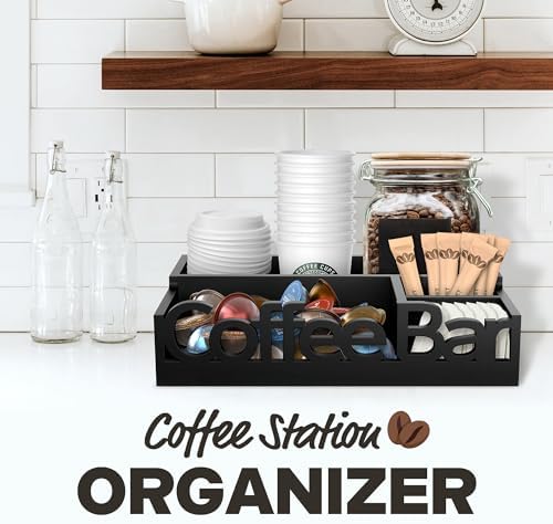 【Organized and Accessible】 This coffee organizer station provides a tidy solution for your coffee bar station, with dedicated spaces for tea bags, coffee capsules, and more. The back compartment is ideal for larger items like paper cups and syrups.