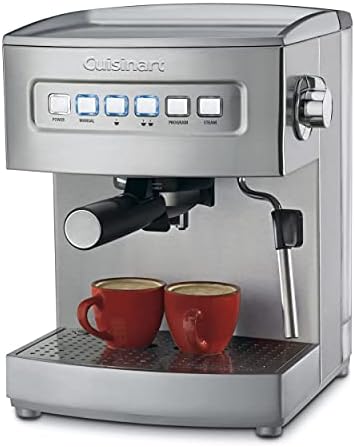 Brew a single or double espresso using either ground espresso or pods with this programmable espresso maker. The unit’s 15 bars of pressure deliver consistently authentic espresso with excellent crema, while its stainless-steel steam nozzle makes it easy to turn an espresso drink into a frothy cappuccino or latte. Pre-programmed cup sizes include 1-1/2 ounces and 3 ounces. The espresso maker’s 64-ounce reservoir removes for easy filling, and its steam button functions separately for convenience. Other highlights include a cup-warming tray on top, a removable drip tray and cover for easy cleanup, and a porta-filter holder with a locking mechanism, which makes it possible to quickly pump out wet grounds after each use. Accessories include a stainless frothing cup and a tamping tool with a measuring spoon. Beautifully designed in professional stainless-steel housing with an embossed Cuisinart logo, the espresso maker measures 10-1/2 by 9-1/4 by 12-3/4 inches and carries a three-year limited warranty. From the Manufacturer With the EM-200, Cuisinart lets you prepare gourmet quality espresso at home. With a programmable system that allows you to pre-select serving size, 15 bars of pressure for maximum flavor, and the option of using ground espresso or pods, you’re in control. A separate steam function and stainless steel nozzle make it easy to froth milk for cappuccinos and smooth lattes. With a removable drip tray and cover, and a portafilter holder with a locking mechanism that makes it easy to dispose of wet grounds after use, clean up is also quick and simple. The Quest for a Perfect Espresso It is generally agreed that there are four basic elements critical to the perfect cup: