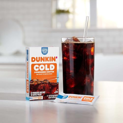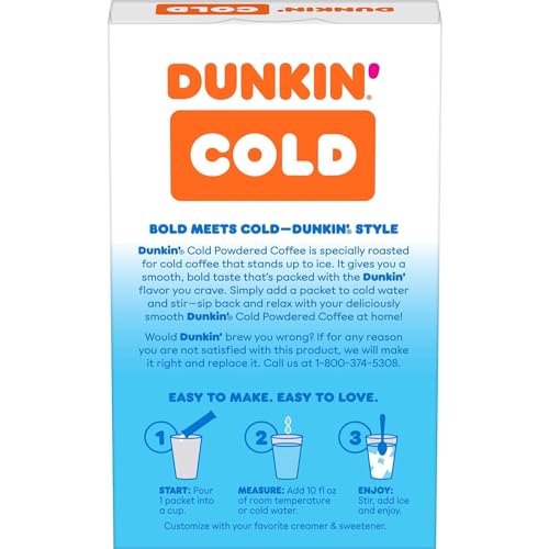 When making iced coffee at home, you need something bold to take on the cold. Dunkin Cold powdered instant coffee packets step up to the task — and make it beyond convenient. Simply add a packet to cold water, stir and add ice. Or, add in your favorite creamer and sweetener for an even more personalized experience. Either way, you can′t go wrong. Dunkin Cold coffee is specially roasted for a cold coffee that stands up to ice. It′s strong, not watery, with a smooth, bold taste that′s packed with the Dunkin flavor you crave. Stock up now to enjoy instant iced coffee anytime.