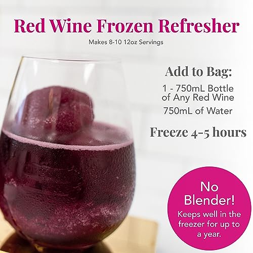 MIXOLOGY MADE EASY – No blender, measuring cup, or bartending experience needed! Fill bag with one 750ml bottle of wine. Refill wine bottle with water and pour in pouch. Stir, seal, and freeze for 3-5 hours. Cheers!