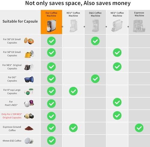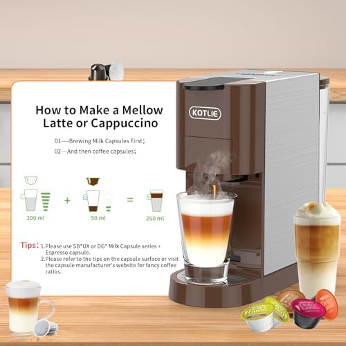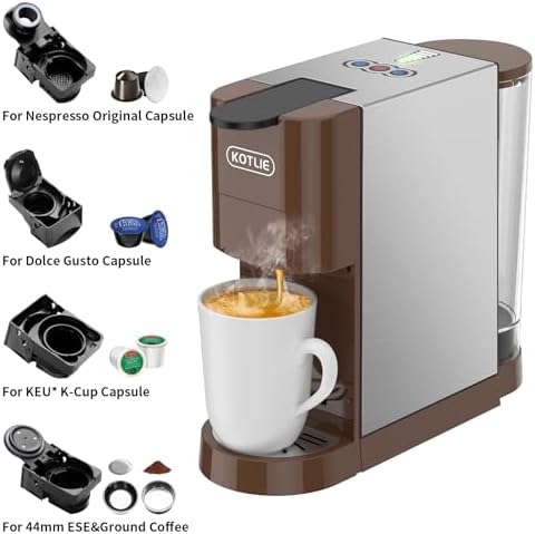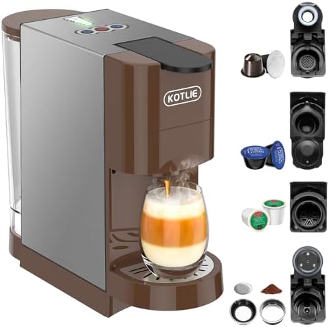 【5in1 Espresso Machine】The KOTLIE 5in1 Espresso Machine AC-513HF comes with 5 kinds of pods and fits for Nespresso capsule, for K-Cup capsule, for DG capsule, for ground coffee and for 44mm ESE coffee powder bag. It is also compatible with A MODO MIO capsules/Caffitaly capsules/Lavazza Blue capsules(Separate purchase pods required from KOTLIE)