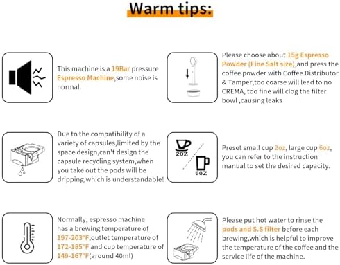 【About TEMP】TEMP of the coffee depends on the ambient TEMP,the heat absorption of the cups,pods and S.S filter bowls.Especially in winter time,it is recommended that the empty pods are inserted in hot water once before each brewing session to heat up the cups and pods as well as the filter bowls,and at the same time to allow the machine to fully preheat