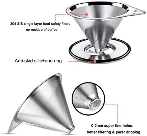 Material: Stainless Steel 18/8 Grade, food safetyCapacity: 1-2 Cups Fits Securely Most CupsDishwasher Safe or Hand WashableReusable Micro Mesh Filter (No Paper Needed)Light weight, Compact Travel Size0.2mm Super fine mesh, stand with silicone ring