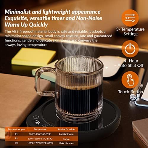 ☕【3-Temperature Settings Keep Coffee Warm】Our coffee cup warmer can slow down the cooling speed of hot beverages; mainly keep your coffee, water, milk, tea, and other beverages at the perfect temperature for a long time, you can enjoy your favorite drinks at the perfect but not-too-hot temperature.You can choose the temperature by touching the “Temp Button” to keep or warm up the temperature of the drink to 130° F/150° F/176° F.