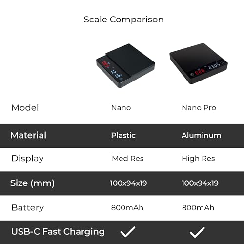 【New version V2】The v2 has the charging port and switches on the left side of the scale to avoid steams coming from espresso machine. It has a dedicated button for changing modes. The base of scale is wider than the old version to provide more stable measurement.