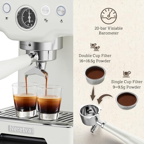 High-Quality Service – Neretva provides creativity and aesthetics for our products. We care about each customer’s experience and satisfaction! If we can assist in any way, please don’t hesitate to contact us. We want you to buy our cafetera espresso with confidence; We offer 12-hour quick-response customer service. | WHAT YOU WILL GET? – espresso machines, portafilter, 2 filters(Pressurized), coffee spoon, dosing funnel, 350ml milk frothing pitcher and user manual.