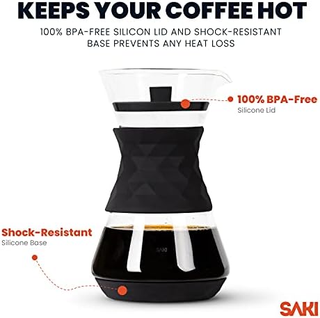 Keeps Warm: With BPA-Free silicone lid and shock-resistant silicone base, Saki Pour Over Carafe minimizes the temperature transition to keeps your brew warm for a more extended period of time than its competitors.
