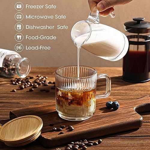 【Glass Cups with Lids And Spoons】: LUCKJOY Ribbed Glassware Set contains 4 vintage glass coffee mugs with embossed vintage rib patterns, 4 gold spoons and 4 natural bamboo lids with sealing rings. Keeps your coffee or tea at the perfect temperature for longer so you can enjoy it at your own pace. A gold spoon adds a touch of luxury to your coffee experience, making it feel like a special treat every time. Glass mug with lid and spoon is your perfect coffee bar accessory.