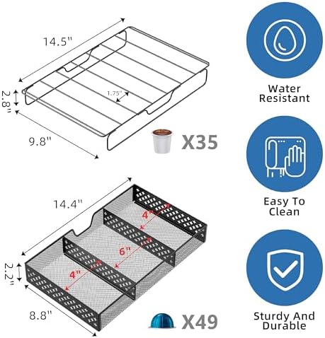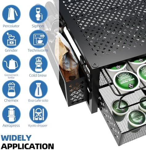 【TWO SLIDING DRAWERS DESIGN】The hanging drawer can hold 35 k cup or 35 coffee capsules, the dividing drawer can hold 28 k cup or 49 coffee capsules,the drawer can be removed and there is a layer of space for storage.