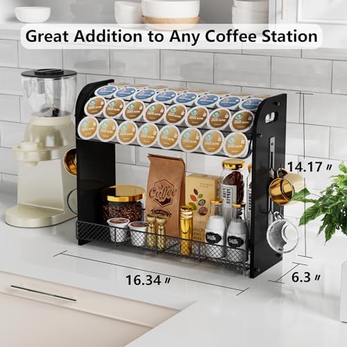 ☕【LARGE CAPACITY K CUP ORGANIZER】Our k cup holder can hold up to 32 k cups, and you can organize your coffee station according to tastes. The bottom tray can store creamer, sugar, coffee beans, disposable cups, and other coffee bar accessories. The hooks on the side allow 4 cups to hang.
