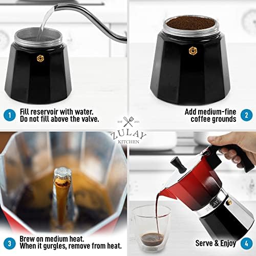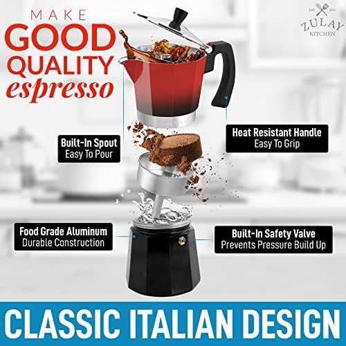 PREMIUM QUALITY DESIGN: Crafted with a durable, food-grade cast aluminum body, the classic Italian design of this espresso maker ensures quick and even heat distribution for a rich and velvety coffee flavor. The built-in safety valve regulates pressure inside the coffee pot for higher caffeine extraction. This Italian espresso maker is designed with a heat-resistant handle, lid knob, and a built-in spout for easy pouring.